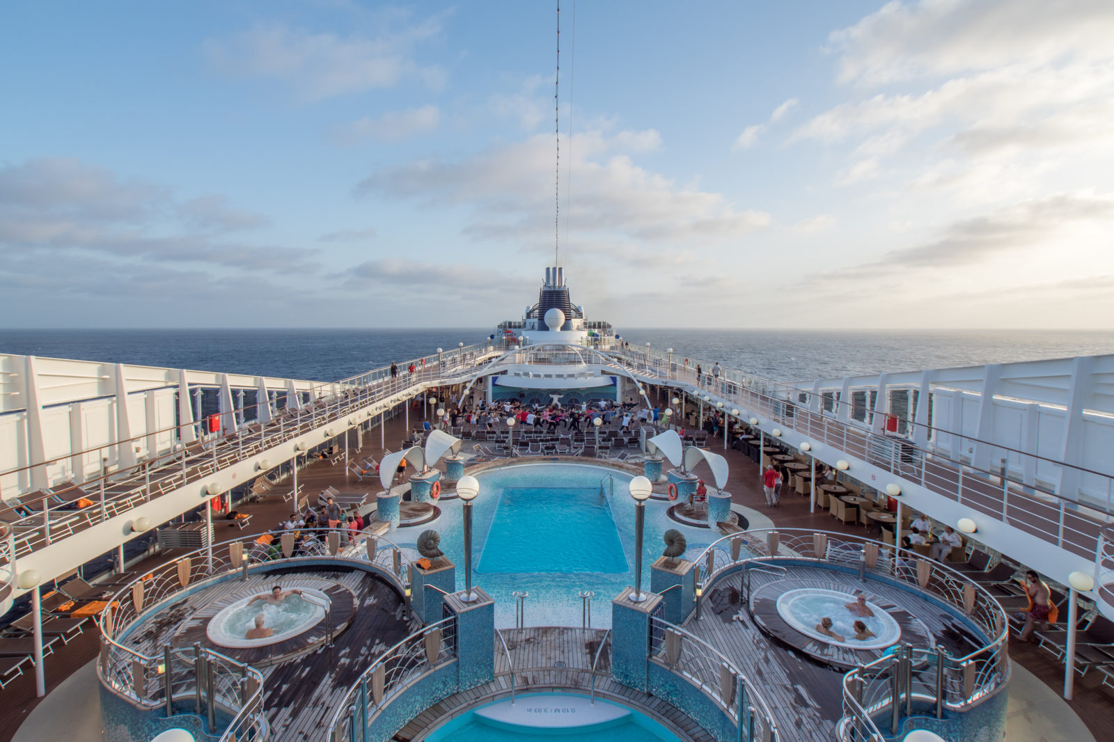Jetzt wollten wir aber das Deck sehen, denn schon bald stand die Abfahrt bevor! Zwei Pools und Unmengen an Liegemöglichkeiten sorgen auf Deck für Erholung und ein Gefühl von Freiheit. Ständig ist irgendwo Wasser zu sehen und so fühlte es sich oft an, als liegen wir am Strand. Die Abfahrt von Buenos Aires war magisch. Kaum ertönte das Schiffshorn, legte sich die Sonne hinter die Skyline und erleuchtete die ganze Stadt in einem warmen orange. Wir werden auf jeden Fall wiederkommen!