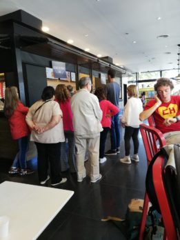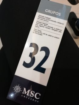 Die Koffer also dem freundlichen Mann in die Hand gedrückt und weiter zur ersten (von etwa fünf) Pass- oder sonstigen Kontrollen. «Ihr Ticket bitte» meinte der sichtlich gestresste MSC Mann. Wir hielten unseren Screenshot der Buchungsbestätigung von «Vacations to go» hin. «Ich kann die Kabinen-Kategorie auf der Bestätigung nicht finden! Macht nichts, hier Ihre Wartenummer». Mit Nummer 32 in der Hand traten wir in den Wartesaal. Mindestens 2000 weitere Passagiere besetzten hier bereits alle Stühle, reihten sich irgendwo ein oder wühlten sich durch die überteuerten Souvenirstände. Als nach einer halben Stunde Wartezeit erst die Nummern 7 und 8 aufgerufen wurden, setzten wir uns ins Café und assen erst mal was zu Mittag. Wenn wir eines gelernt haben, dann dass sich aufreibende Situationen mit einem gesättigten Magen besser ertragen lassen.